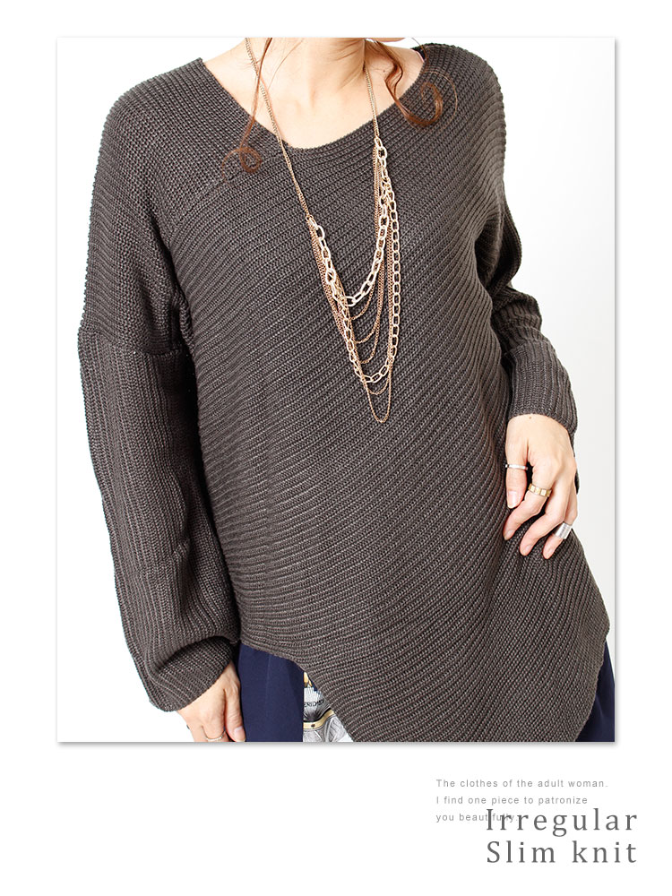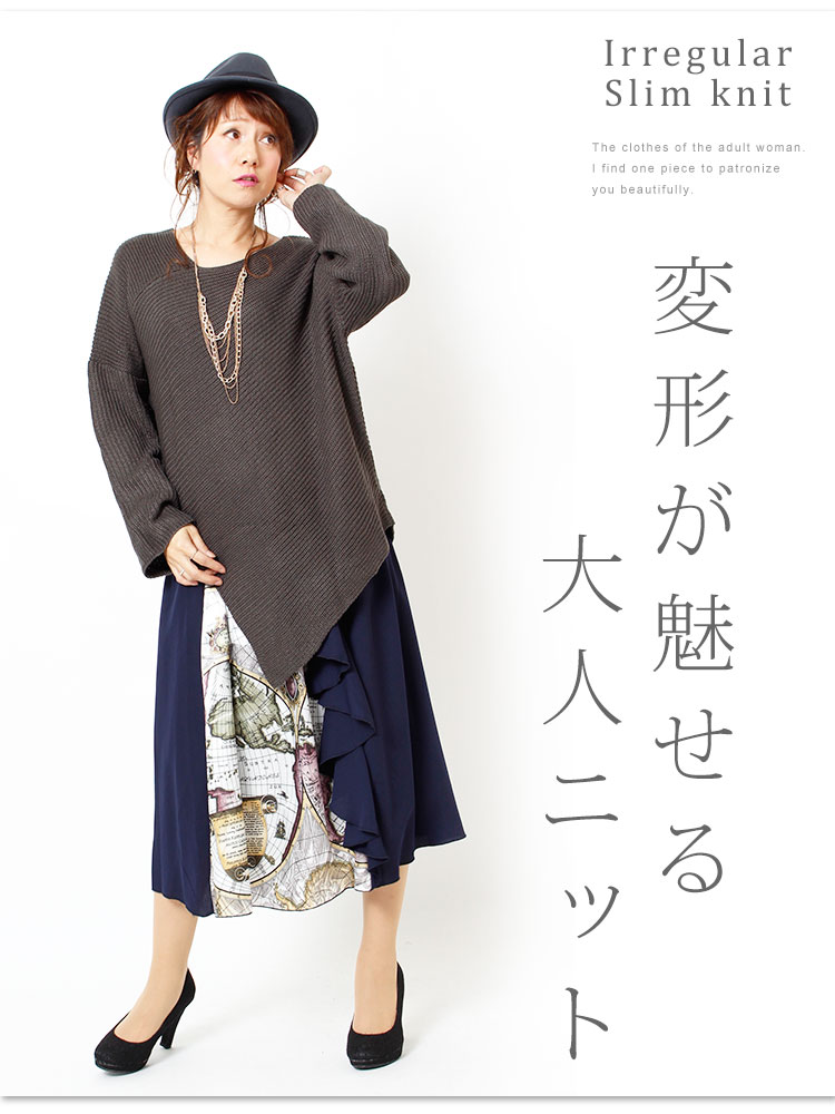 女性らしい大人ニット♪ 大きいサイズ レディース カーキ 春服 秋服 春 秋 長袖 ニット 変形裾 イレギュラーヘム 無地 シンプル アシンメトリー デザイン 丸首 チュニック 即納 スリムニット otona お洒落 可愛い アラモード alamode 20代 30代 40代 50代 婦人服