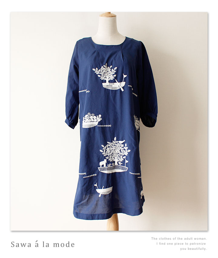 ナチュラルな刺繍に大人惚れ ワンピース ミディアム 7分袖 ネイビー 紺色 膝丈 ひざ丈 レディースファッション ナチュラル mori 森ガール otona kawaii フリーサイズ サワアラモード sawa alamode
