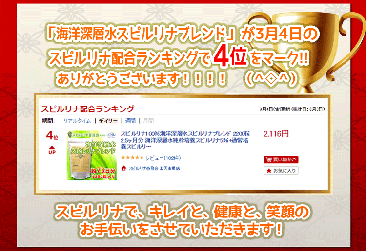 ◆ 海洋深層水スピルリナブレンド 海洋深層水で純粋培養したスピルリナ5%と、塩湖のアルカリ水で培養した従来のスピルリナ95%の混合商品です。