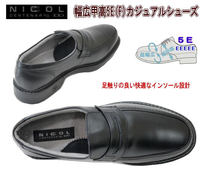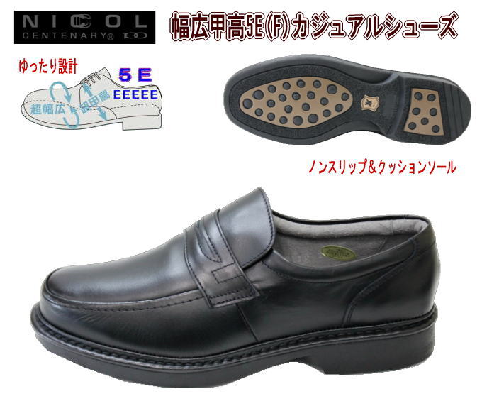 カジュアルシーンはもとよりビジネスシーンにも使える充実の一足 商品名 NICCOL 6110 黒 5E ヒモ無しローファーカジュアルシューズ 素材 甲部分:本革 底材:合成底 底材の長さ:285mm 幅:102mm(25cmで計測) 日本製 片足:360約g(25cm) サイズ 25cmから27cm 幅表示:5E 注意 ビジネスシューズの5Eの方にほどよく合います。