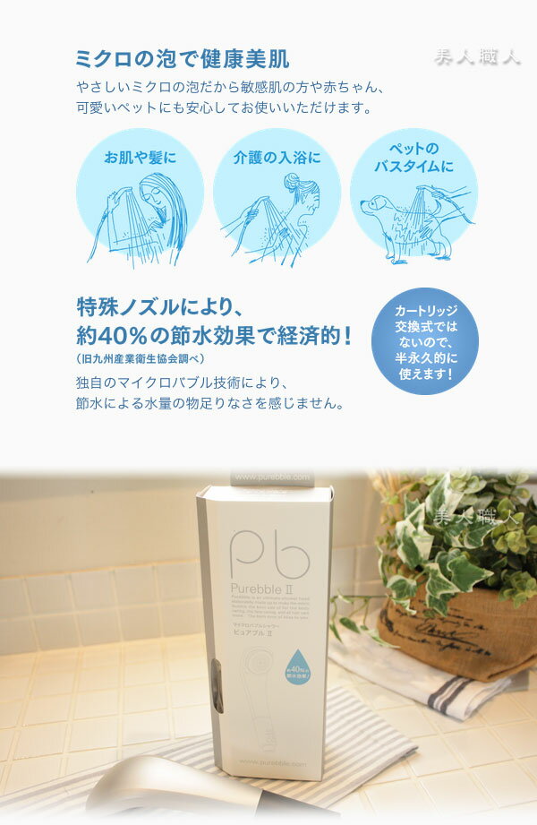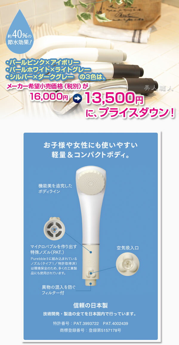 シャワーヘッド「ピュアブルII」 マイクロバブルシャワー ・パールピンク×アイボリー ・パールホワイト×ライトグレー ・シルバー×ダークグレー ミクロの泡で健康美肌に! やさしいミクロの泡だから敏感肌の方から赤ちゃん、ペットにも安心してお使いいただけるシャワーヘッド ミクロの泡で健康美肌 やさしいミクロの泡だから敏感肌の方や赤ちゃん、可愛いペットにも安心してお使いいただけます。