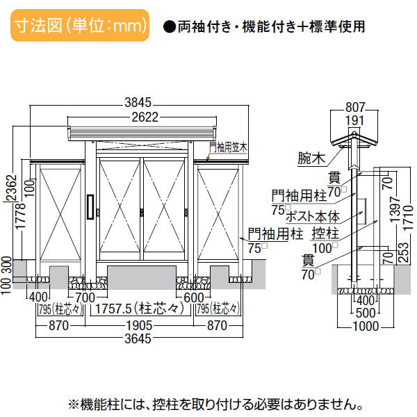 商 品 詳 細商品名数寄屋門(すきやもん) ニュー福寿門【切妻屋根付き 両袖付き 袖壁+袖壁 縦格子タイプ 欄間なし 機能付+標準】サイズ(mm)幅3845×高さ2362 ※詳細は寸法図にてご確認ください。