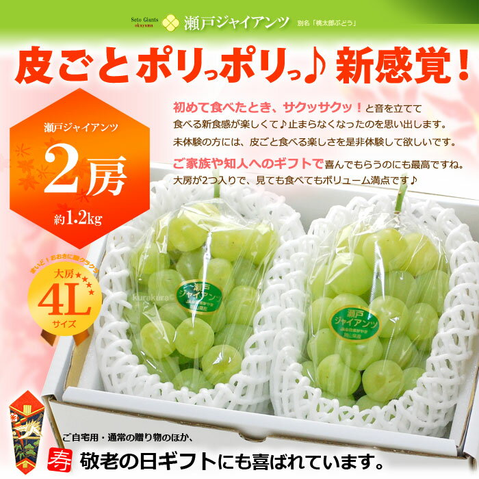 【瀬戸ジャイアンツ(4L)大2房】 皮ごと食べれて種もない!岡山の高級ぶどう 8月下旬〜順次発送!/ ・ポリポリ♪
