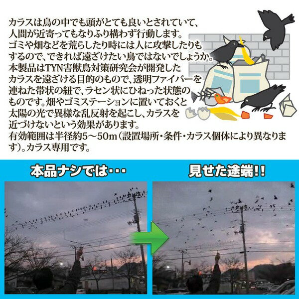 カラスよけ/カラス対策 「カラスなぜ逃げる」 どこでも取付けタイプ 日本製■商品内容カラスは鳥の中でも頭がとても良いとされていて、人間が近寄ってもなりふり構わず行動します。
