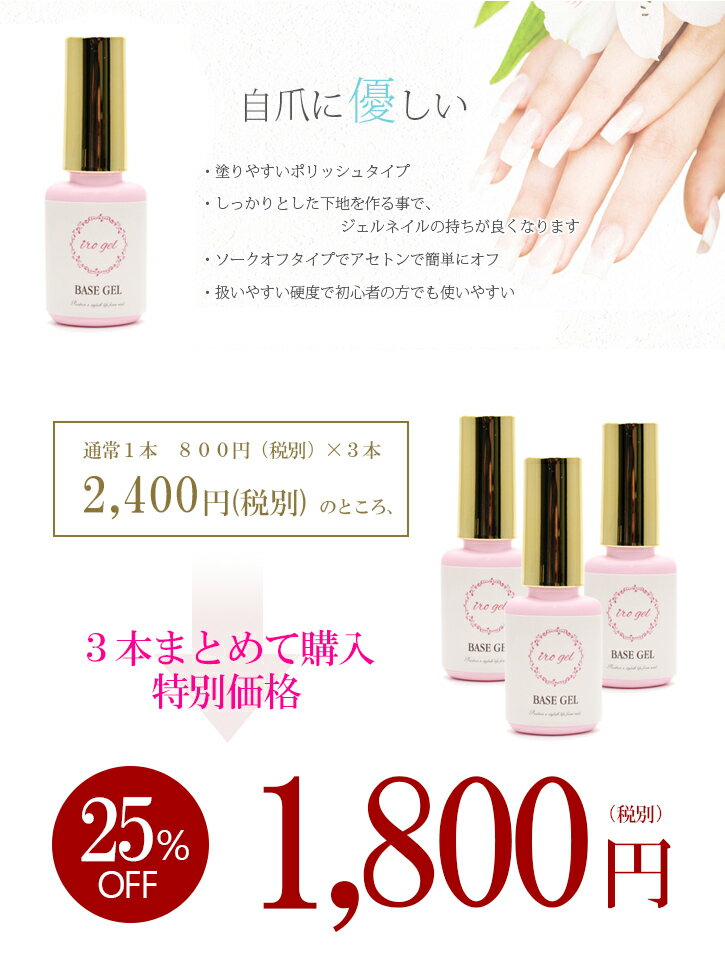 メーカー 商品名 25%OFF! 「irogelベースジェルお得な3本セット」 特徴 人気のベースジェルがセットになってお求めやすくなりました! ● 確かな密着!リフト(浮き)しない下地を作る ● 長持ち ● UV/LED両方に対応 ● 塗りやすいポリッシュタイプ ● ソークオフタイプ!アセトンで簡単にOFF ● 初心者でも扱いやすい硬度 ≪硬化時間目安≫ LEDライト 6w 60秒〜90秒 24w 30秒〜60秒 36w 30秒〜60秒 48w 30秒〜60秒 UVライト 36w 120秒 ※上記は目安であり、お使いのライトにより異なります。